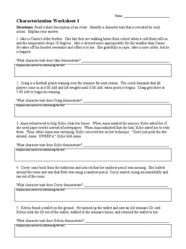 Read a short description of an event. The grade 5 comprehension worksheets focus on some of the building blocks of stories: What character trait does kylie demonstrate? _ characterization worksheet 1 directions: Explain your answer by referencing the text.